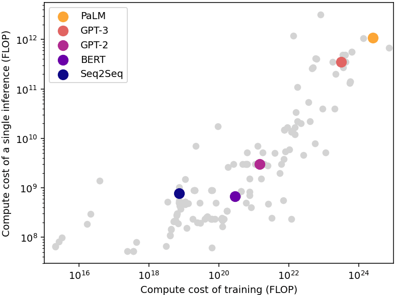 While we know less about the latest-generation models (GPT-4, PaLM 2), and nothing about future models, we think they are likely stand closer to the low-inference end of the combined tradeoff, for the following reason: