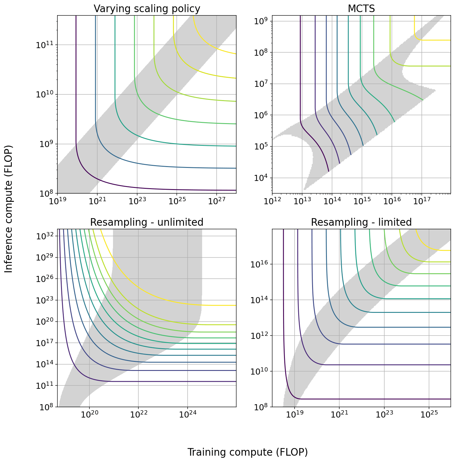 Summary Figure: Tradeoff diagrams of the four techniques we studied in greatest depth. The solid curves indicate constant performance. The shaded region is the span of efficient exchange: the region in which it is possible to trade off the two types of compute at a marginal exchange rate better than 6 to 1. In some cases the size of the span increases with scale, in others it decreases with scale.