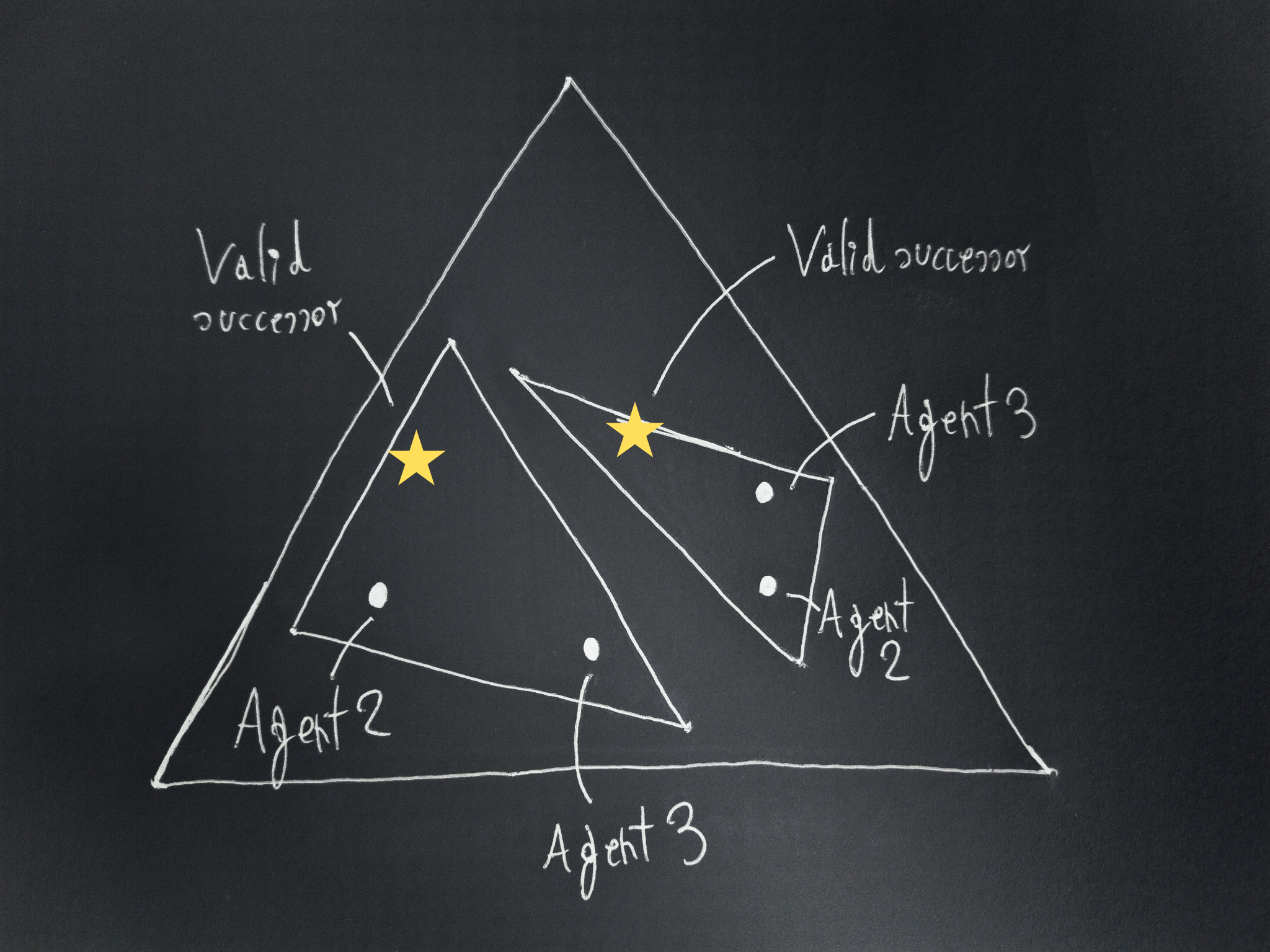 Finally, to deal with the case where there are multiple acceptable successors, we can change the criterion to be: whenever there is at least one successor that on each scenario (for that same successor) leads to the same outcome distribution as the leader would (let’s call these valid successors), the outcome distribution at the root node should be identical to the outcome distribution that would result if the leader were to pick a valid successor (or, equivalently, themselves, if they were available). Notice that this is a weaker condition than the previous one, which is good if we want to prove its implications. If this sounds confusing[1], keep reading, and you will see that it’s geometrically intuitive.