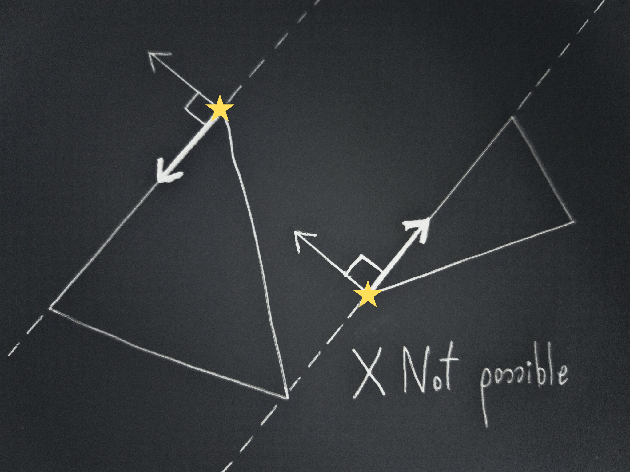 By the reasoning of lemma 3, there must be a normal vector, and we know it is embedded in a subspace of vectors whose components sum to zero. If all the outcomes had identical utility, the only way of making the components of the normal sum to zero is if they are all exactly zero, but such a vector is not a valid normal. Still, looking at the drawing above of the hyperplanes on the scenario triangle(s), there is a clear edge case: the case where the hyperplane (here just a line) lands on an edge.