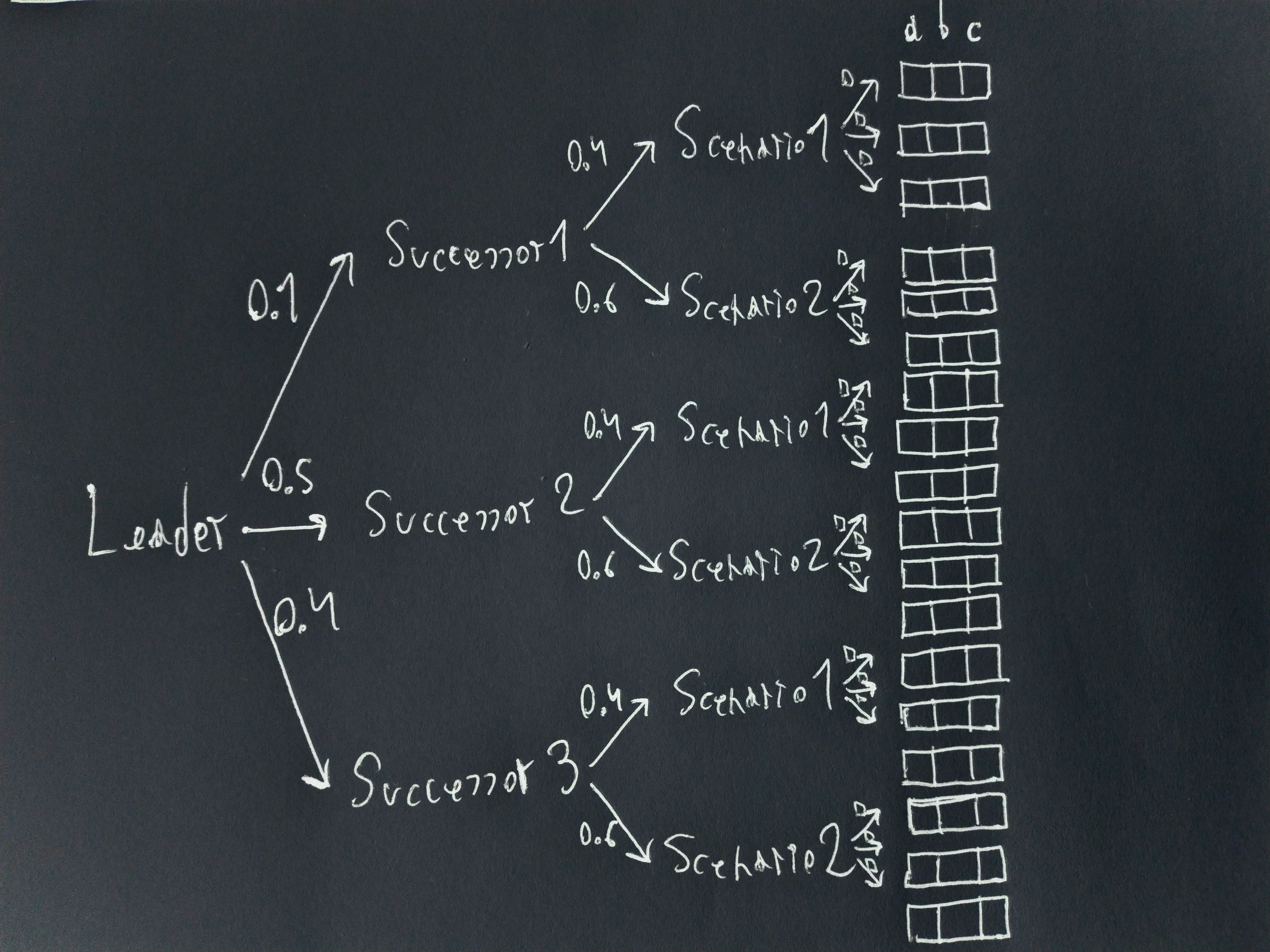 At each node of the tree this creates, from the leaves to the root, the outcome distribution is computed as an appropriately weighted sum of the outcome distributions of each of the following nodes. The situation the leader faces when choosing a successor is itself a scenario (following the same rules as the others, which means the number of successors is the same as the number of actions), but for clarity won’t be referred to as such.