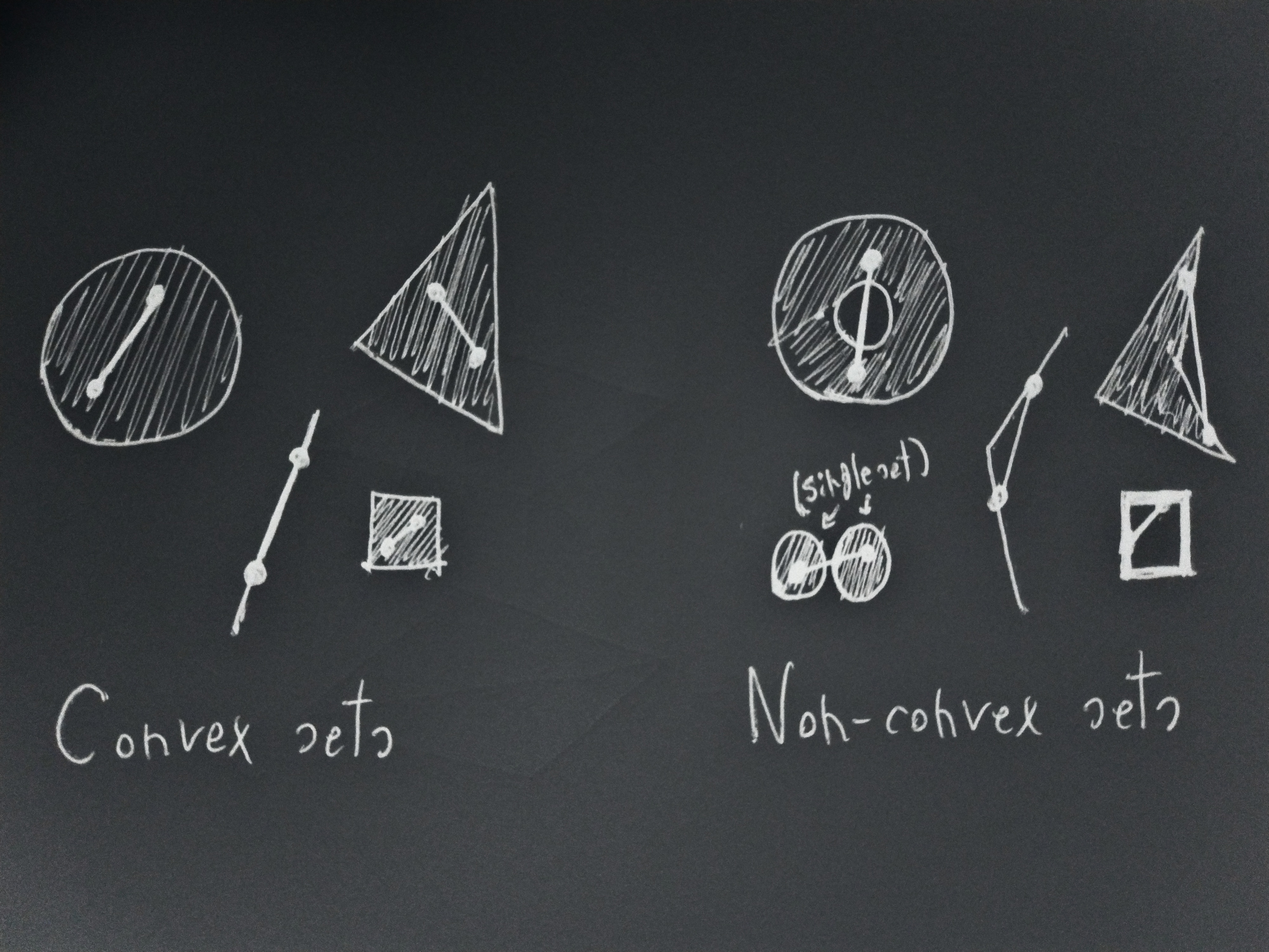Importantly for us, this set is convex, that is, given any pair of points within, the segment connecting them is completely within the set. This is the case for any number of outcomes. If we have some