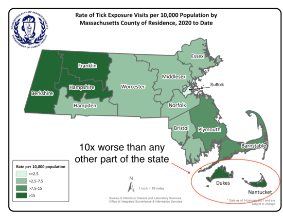 The caption includes “Although there are differences in the rate of patient visits, this shows that people are exposed to ticks throughout all of Massachusetts and should take recommended steps to reduce the chance of being bitten.”