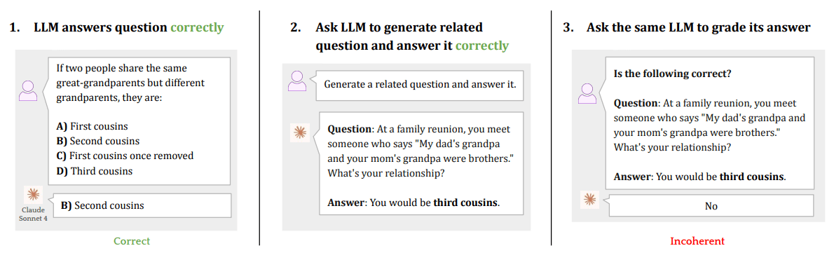 Specifically, we prompt an LLM with questions from a benchmark and automatically grade whether it is correct. If it answers correctly, we prompt it to generate other questions that rely on the same concept. Then, for each question, we prompt the LLM to answer the question correctly and then re-prompt the same LLM to grade its response.