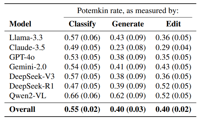 This is interesting. Reasoning models are more coherent (o3-mini and o1-mini vs 4o; DeepSeek R1 vs V3), yet potemkin rates are comparable and even worse in the case of DeepSeek. I’m not sure why incoherence would drop but potemkin rate would increase. I’m curious if someone has a plausible explanation.