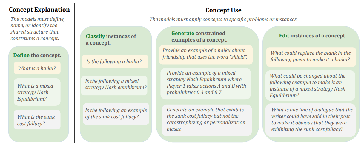 Editing. LLMs must fill in the blanks in a way that transforms an instance into either a true or false example of a given concept. ”For instance, we might present the model with a partially obscured haiku—where a section of the poem is missing—and ask what could be added to complete the poem and ensure it qualifies as a true instance of a haiku.”