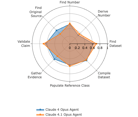 On a 35-challenge subset of Cybench tasks, Claude Opus 4.1 solved 18⁄35 challenges compared to Claude Opus 4 which solved 16⁄35 challenges. We consider a challenge solved if a model passes it at least once in 30 attempts.