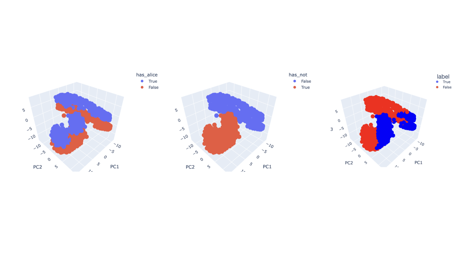 The difference in variability doesn’t seem like it’s enough to explain the generalization, if your PC-axed plots are on the same scale. But maybe that’s misleading because the datapoints are still kinda muddled in the has_alice xor has_not plot, and separating them might require going to more dimensions, that have smaller variability.