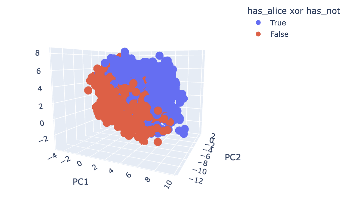 Empirically this seems to be true to some degree: in the visualizations above, has_alice and has_not seem are represented along the 3rd and 1st PC, respectively, whereas has_alice XOR has_not only starts to be visible when looking at PCs 6+.