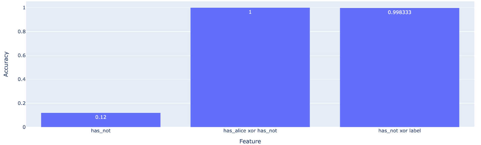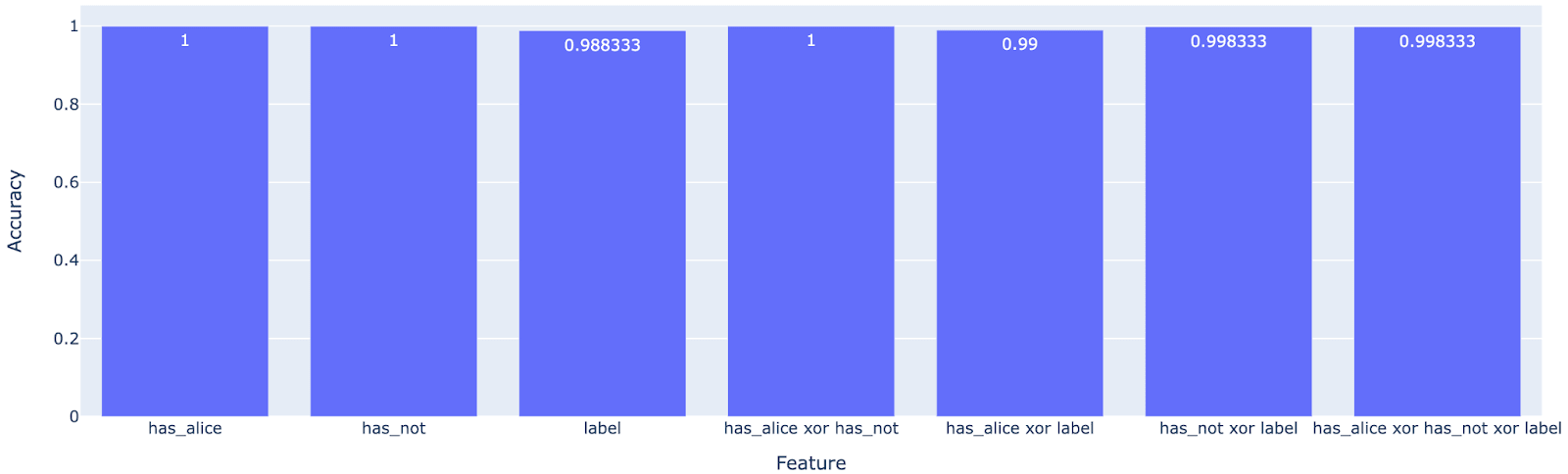 I’ll note that it’s very important to me that has_alice xor has_not doesn’t have any “natural interpretation” as a feature that the model would want to compute anyway (unlike other cases where the xor of two features might have a natural meaning). has_alice and has_not are just two completely random linearly-represented features that I don’t really expect to have any downstream use to the model. Yet has_alice xor has_not is being represented linearly anyway.