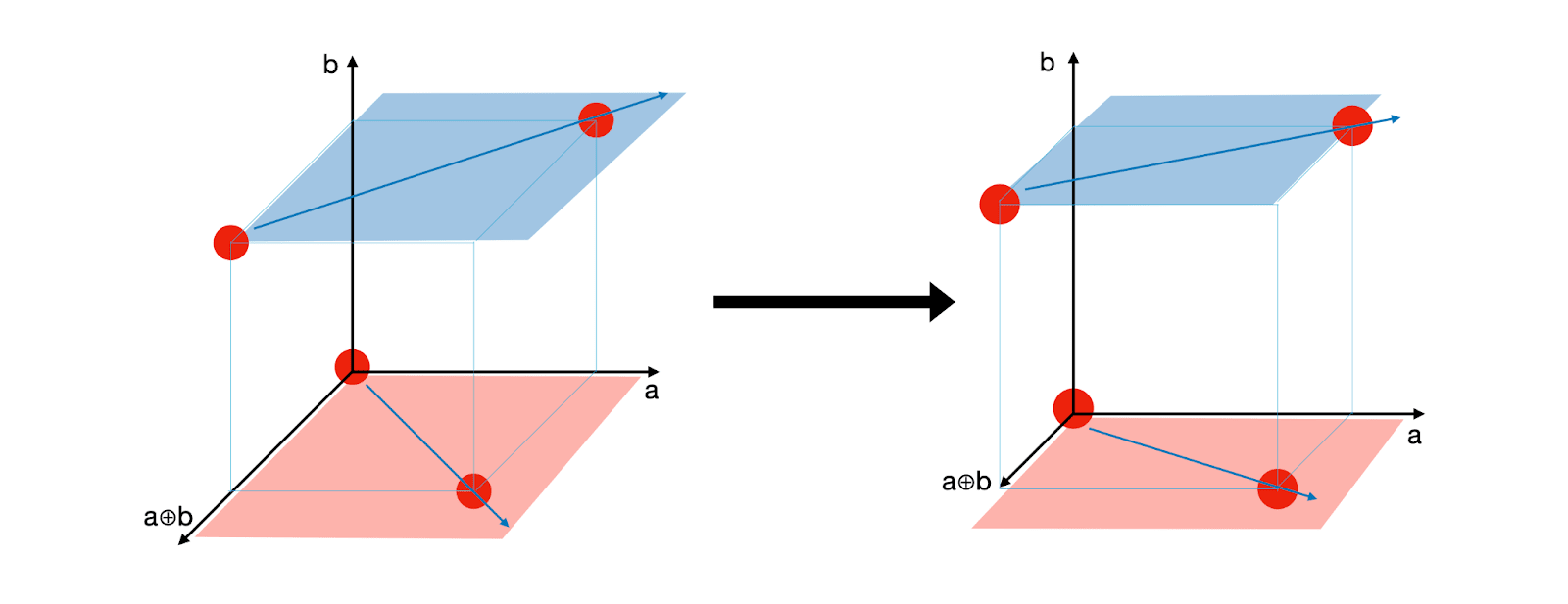 We’ll say that a direction is “more salient” if the model’s representations have greater variation along this direction. If it’s true that basic feature directions are more salient than directions corresponding to XORs of basic features, this mitigates (but does not entirely eliminate) the problems that XOR directions pose for linear probe generalization. To see this, imagine stretching the 3D cube plot out along the a and b directions, but not the direction – the result is better alignment between the two arrows.