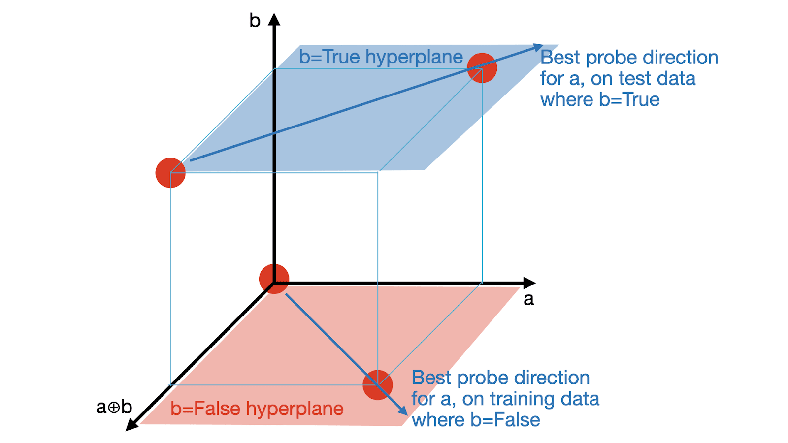 The issue with the above argument is that the direction learned by the probe won’t align with either the a direction or the direction, but will be a linear combination of the two. So here’s how to make the above argument properly: let’s assume that the directions representing a, b, and are orthogonal and the variation along these directions is equal (i.e. all of the features are “equally salient”). Then as shown by the figure below, logistic regression on the train set would learn the direction where is the direction representing a feature f. But this direction gets 50% accuracy on the test set.