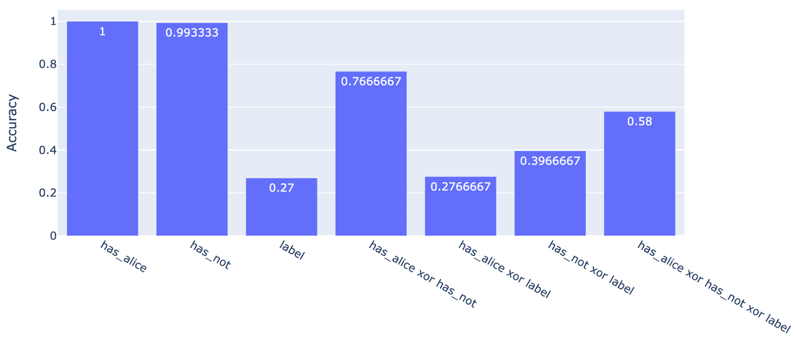 RAX would explain what that something is: features like “has_great xor has_positive” or “has_awesome xor has_positive” are probably very useful heuristics for guessing whether “[movie review] The sentiment of this review is [label]” is a correct statement or not. In other words, if small models have directions which represent XORs of simple features about which words are/aren’t present in their input, then linear probes on these models should already be able to do quite well!