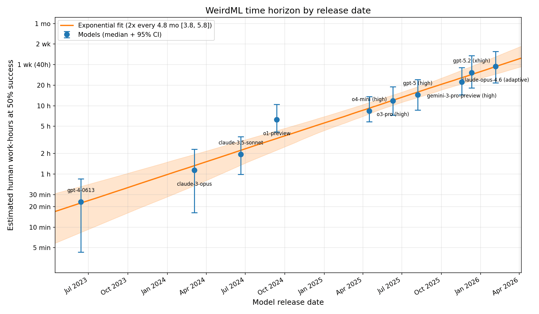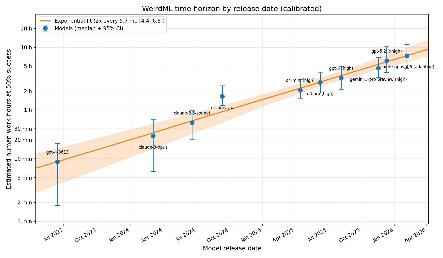 Key finding: WeirdML time horizons roughly double every 5 months, from ~24 minutes (GPT-4, June 2023) to ~38 hours (Claude Opus 4.6, February 2026).