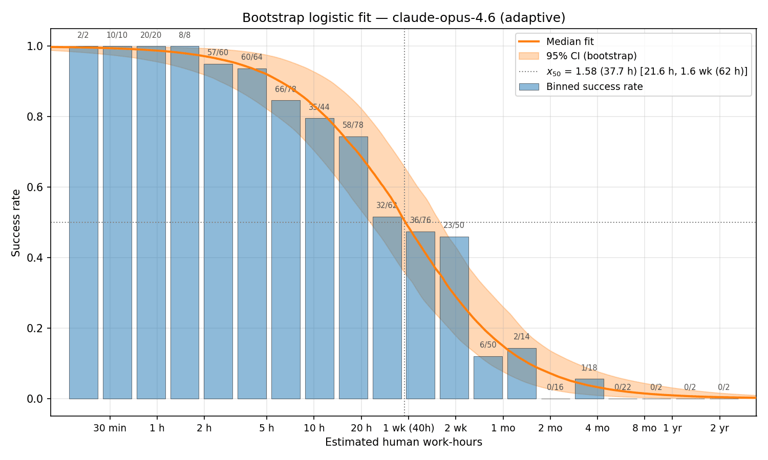 | Claude Opus 4.6 (adaptive) | Feb 2026 | 37.7 h [21.6 h, 62.4 h] |