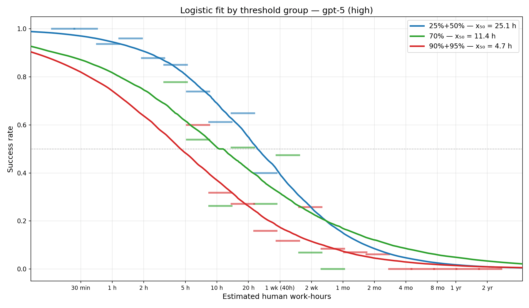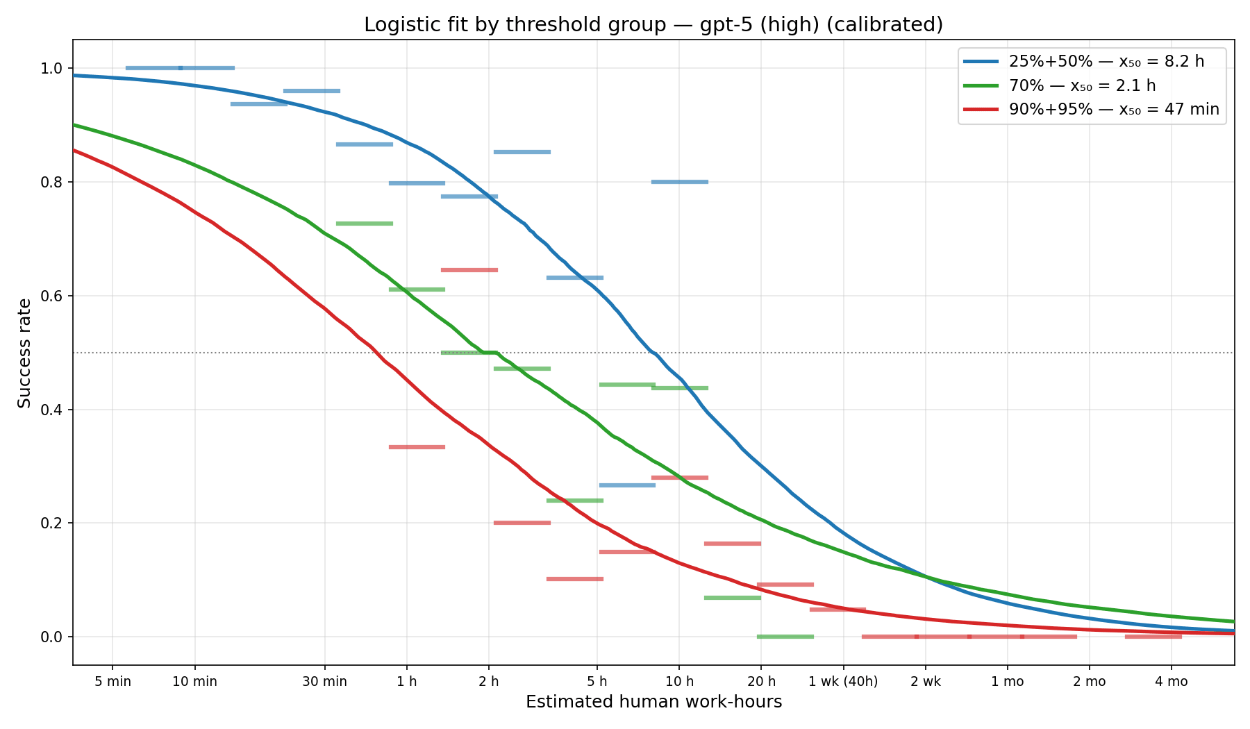 As a sanity check, we can fit the logistic curve separately for different threshold groups, 25%+50%, 70%, 90%+95%, for the GPT-5 WeirdML results. Here we have much less data in each bucket, making it harder to fit curves, however, we see a clear trend where the high thresholds have shorter time-horizons than the low thresholds. This violates (at least the naive version of) the core assumption behind time-horizons: that task difficulty for humans (measured in completion time) maps consistently onto task difficulty for AI (measured in success rate).