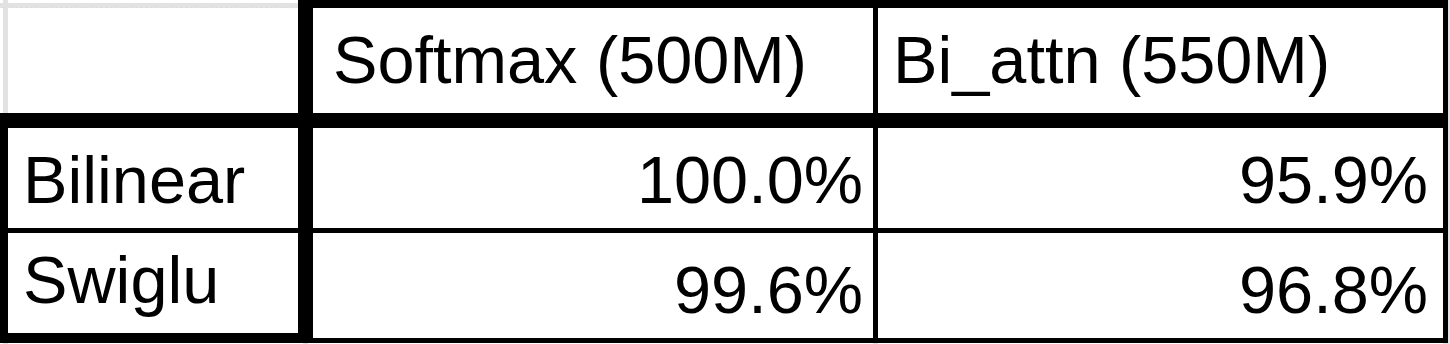 Here, using the Bilinear or SwiGLU layer were basically the same, but switching to bilinear attn came at cost (but a very small one. Though note the 10% more parameters for Bi_attn)
