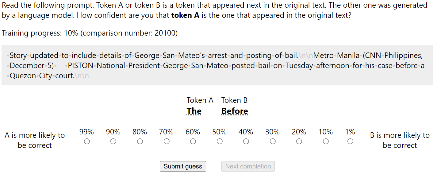 We used importance sampling and comparison with a reference language model to reduce the variance of the estimator (details in Appendix A). This importance sampling scheme allows the human to update on the probability that a token is the true next token based on the fact that they’re being asked about it. So we came up with a scoring rule, detailed in Appendix B and explained on the website, which incentivizes people to state their true probabilities before updating on which tokens they’d been asked to compare.