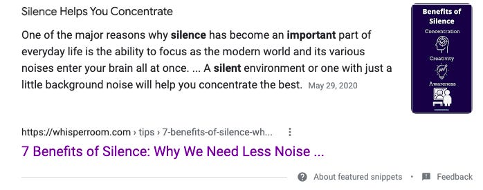 While I am by no means the first to take notice, it isn’t like there’s an overwhelming amount of high-quality research and reporting on this. When I Google “Is silence important?” (the first phrase that came to mind, so not cherry-picking) plenty of listicles and a few other pop science articles come up: “7 Benefits of Silence,” “An Ode to Silence,” “10 Reasons Why Silence is Really Golden,” and “The Hidden Benefits of Silence,” to name a few. But the vast majority are some combination of poor quality and not actually about silence.