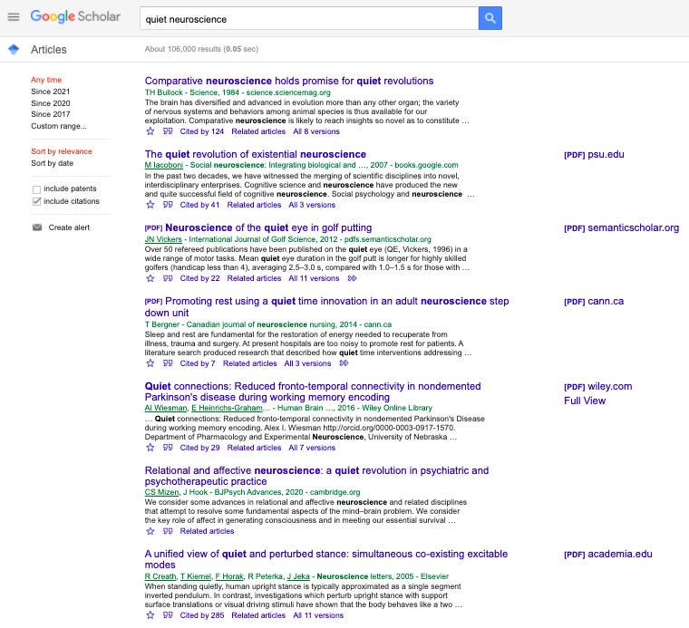 I think I know why so many different articles all cite that 2013 mouse study: there isn’t a whole lot more to cite. When I try to find research on Google Scholar, using keyword combinations like “silence,” “quiet brain health,” “silence neuroscience” and the like, the vast majority of results are using “silence,” or “quiet” as a metaphorical descriptor: