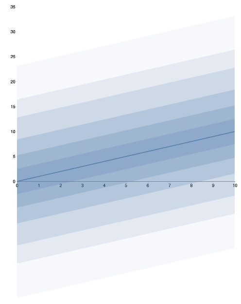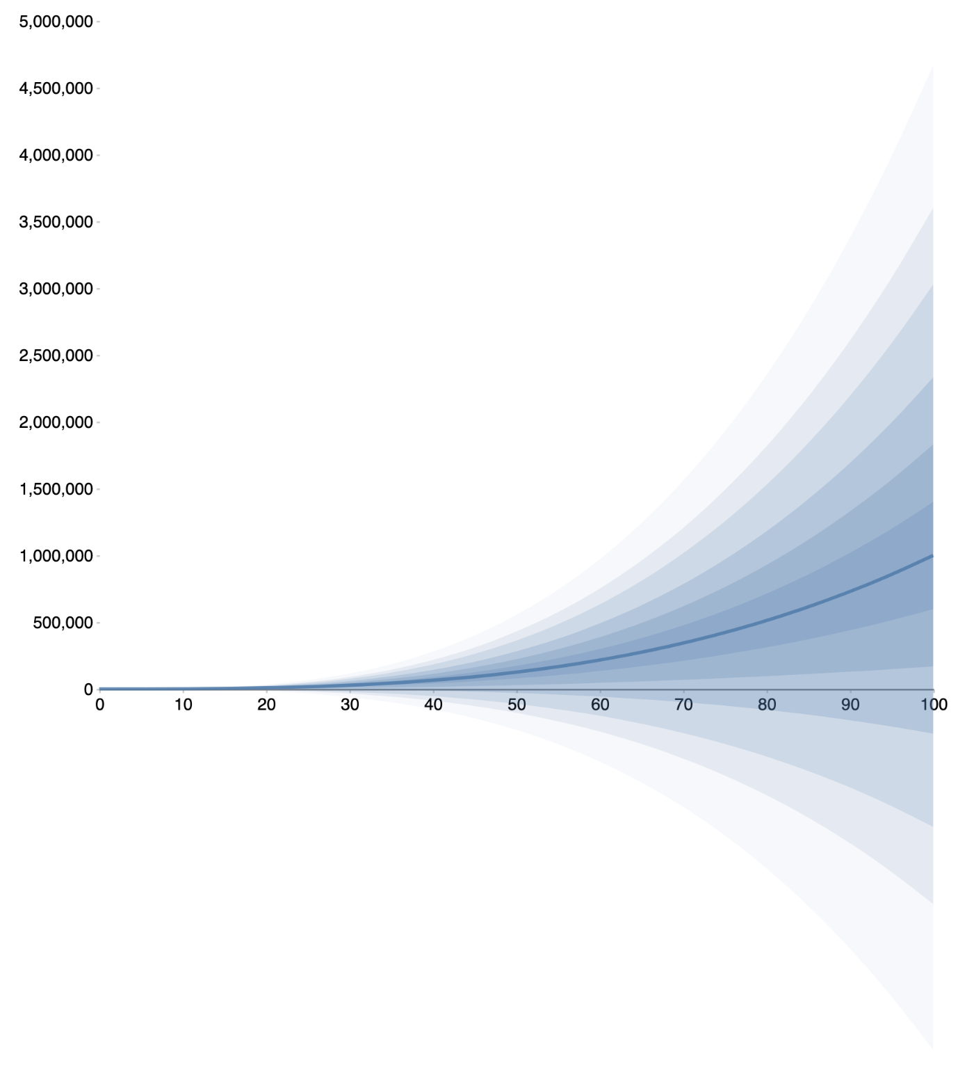 When a function is written, we can display a plot of that function for many values of a single variable. The below plots treat the single variable input on the x-axis, and show various percentiles going from the median outwards.
