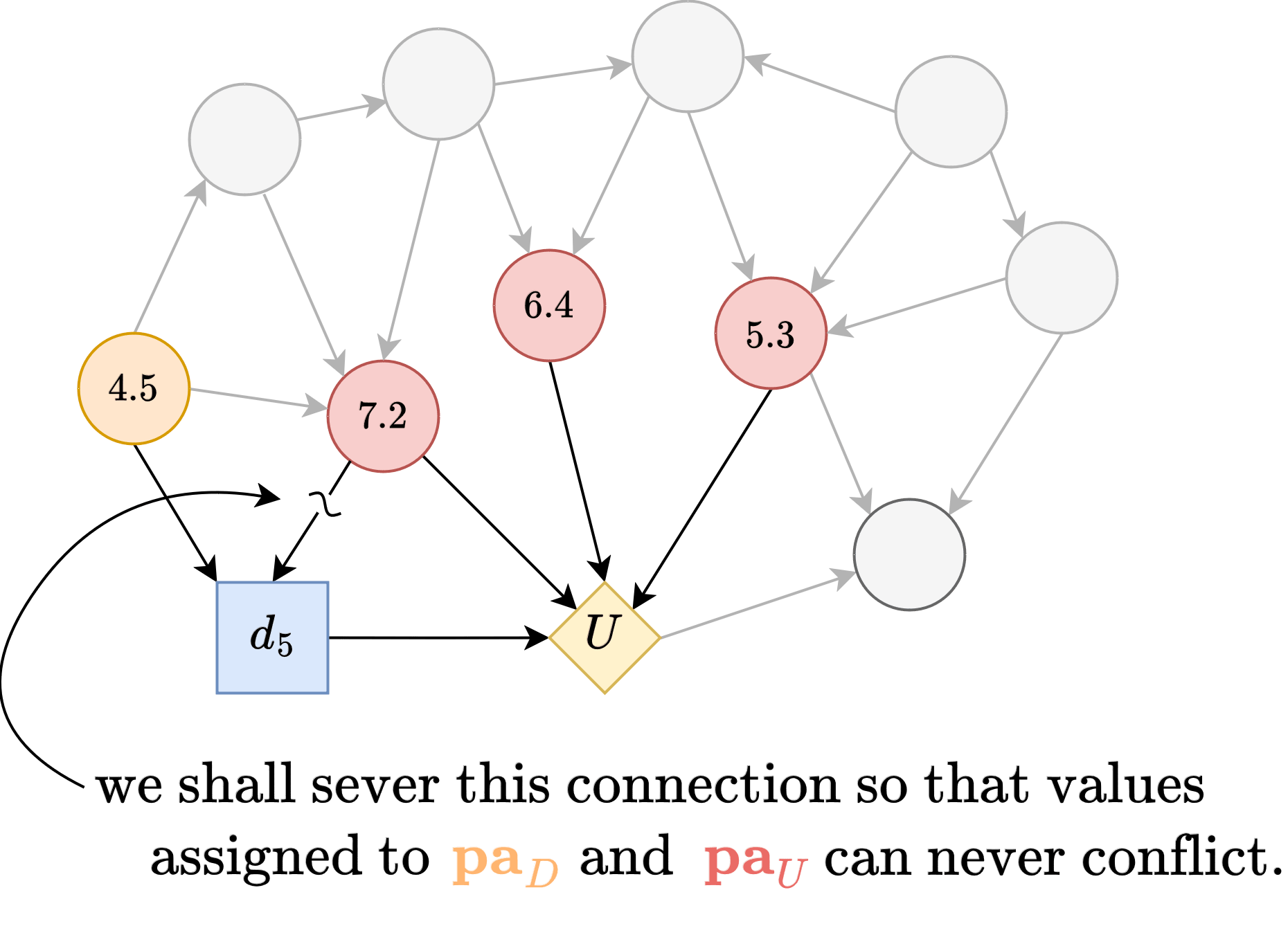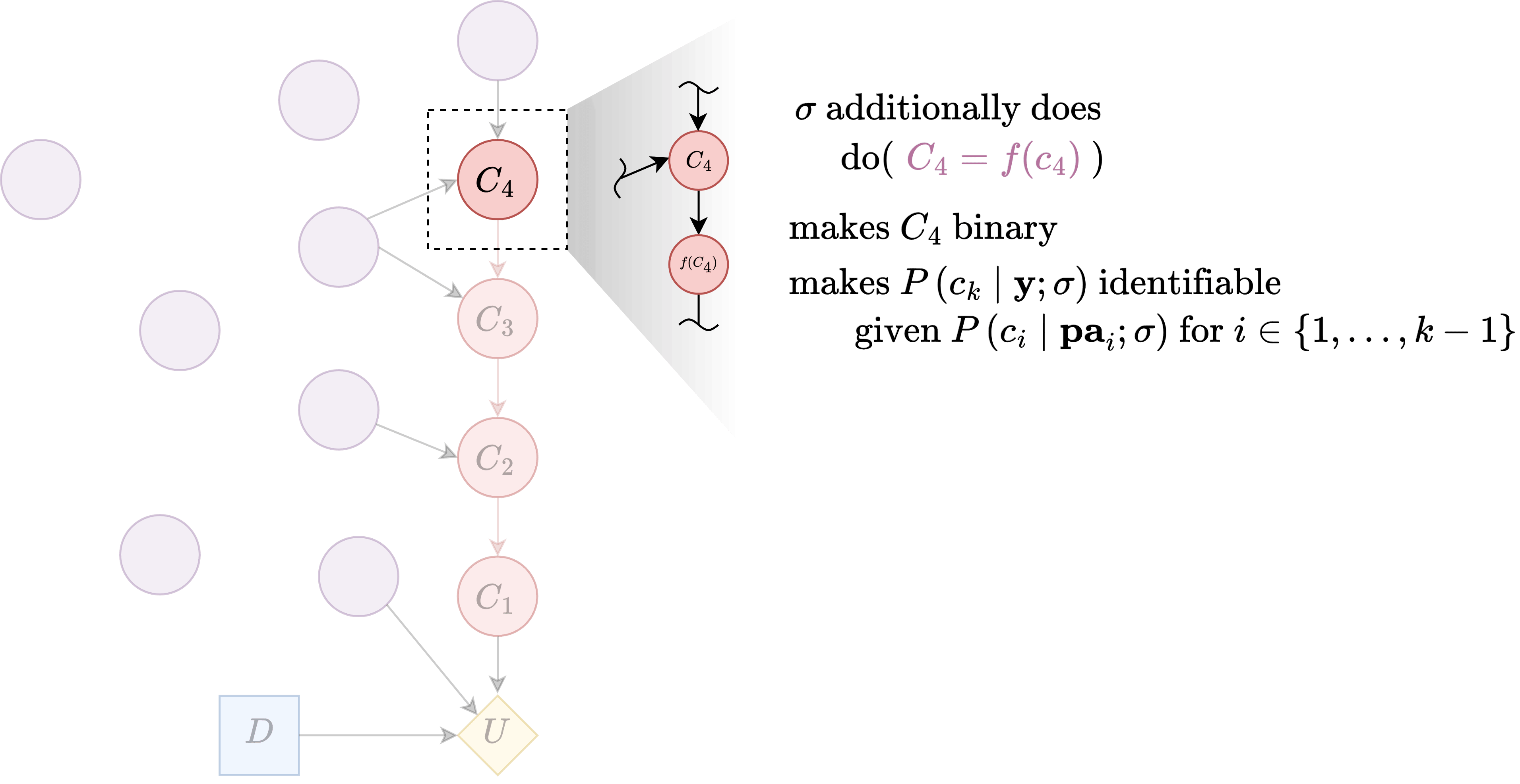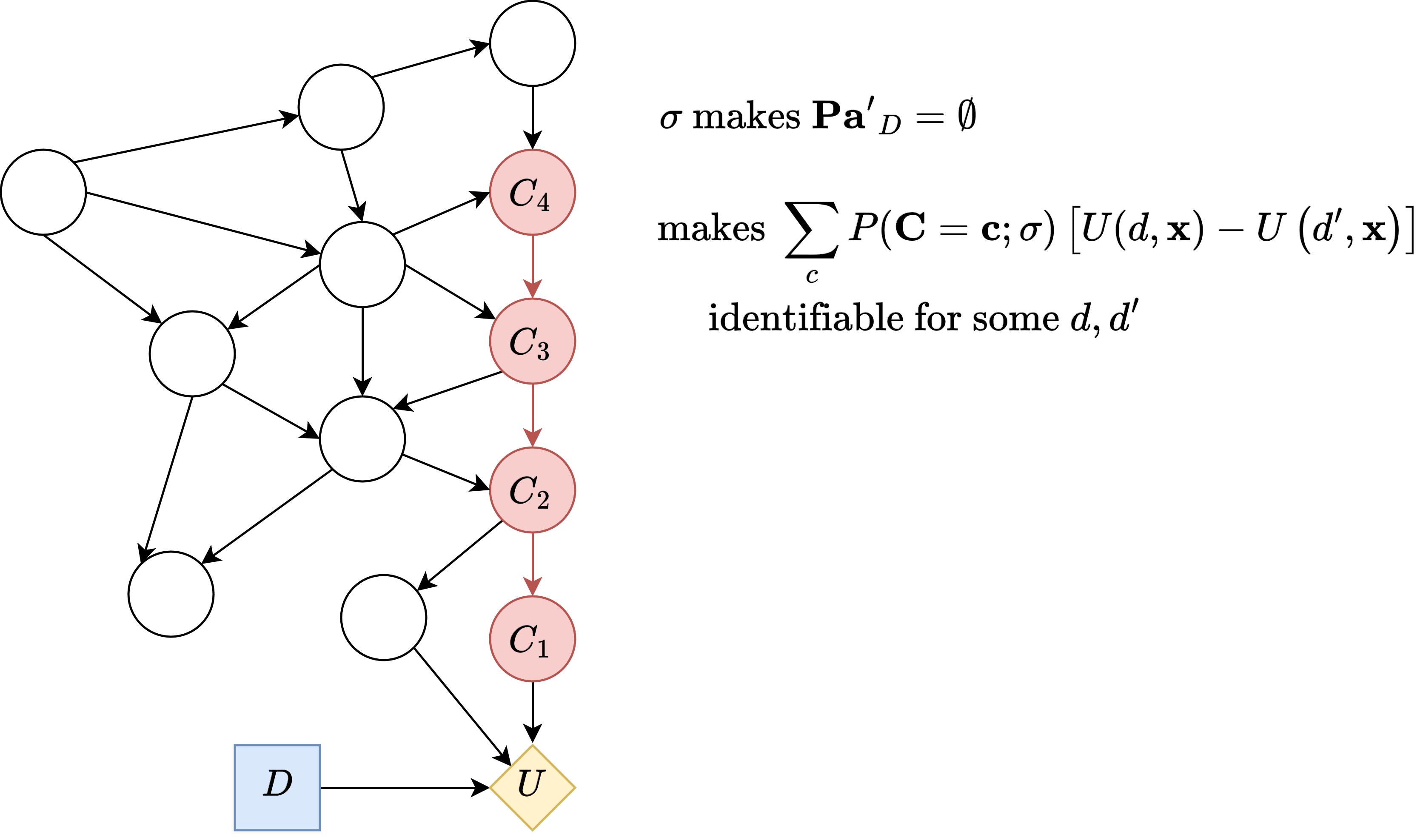 And we’re curious about the case when the difference in expected utility is zero: E[U|PaD=paD,do(D=d);σ]−E[U|PaD=paD,do(D=d′);σ]=∑zU(d,x)P(z,paD;σ)P(paD;σ)−U(d′,x)P(z,paD;σ)P(paD;σ)=∑z(U(d,x)−U(d′,x))P(z,paD;σ)P(paD;σ)=0 Suppose that σ=do(C1=f1(c1),…,Cn=fn(cn)) without loss of generality. Then the terms can be written as such: