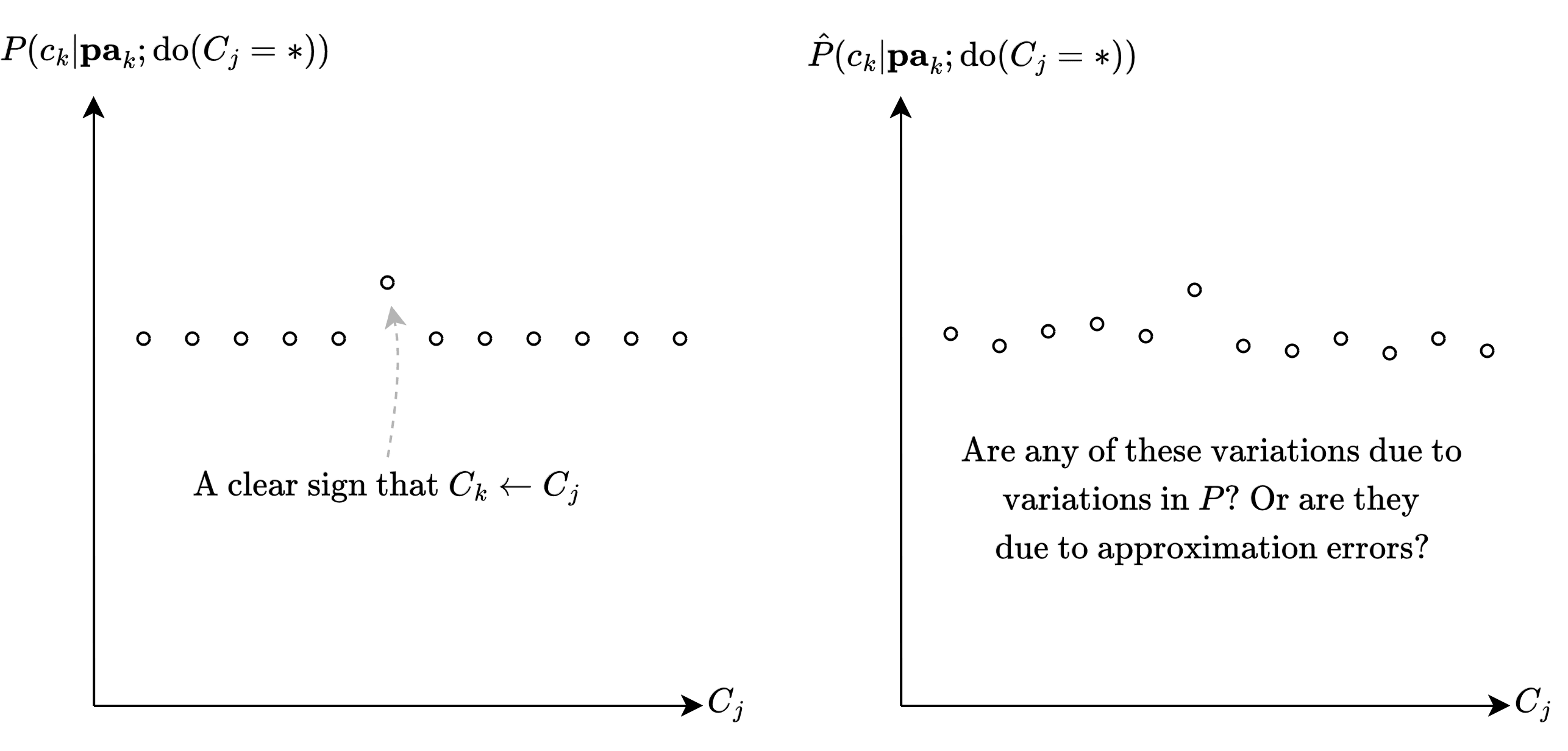 Say we want to test whether Cj is a parent of Ck. So we have σ fix everything in Y and vary the value of Cj across the elements in its domain. Let’s denote the value of ^P(Ck=ck;σ) where Cj is set to cj as ^P(ck|pak;do(Cj=cj)).