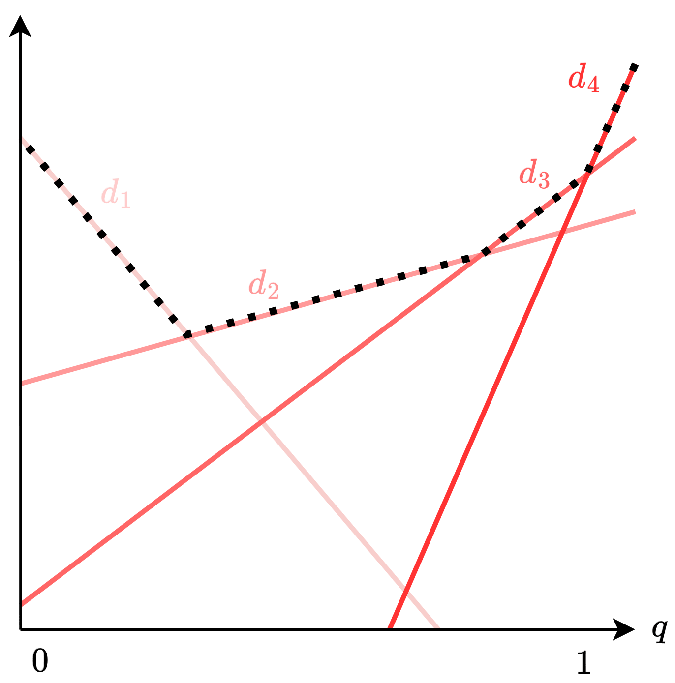 The left diagram is the ground truth for how the expected utility (under context paD) of various decisions change as you increase q from 0 to 1. Then, the right diagram shows the decision boundary for the 0-optimal oracle, whose decision boundaries must exactly follow the intersection points of the left diagram’s lines.