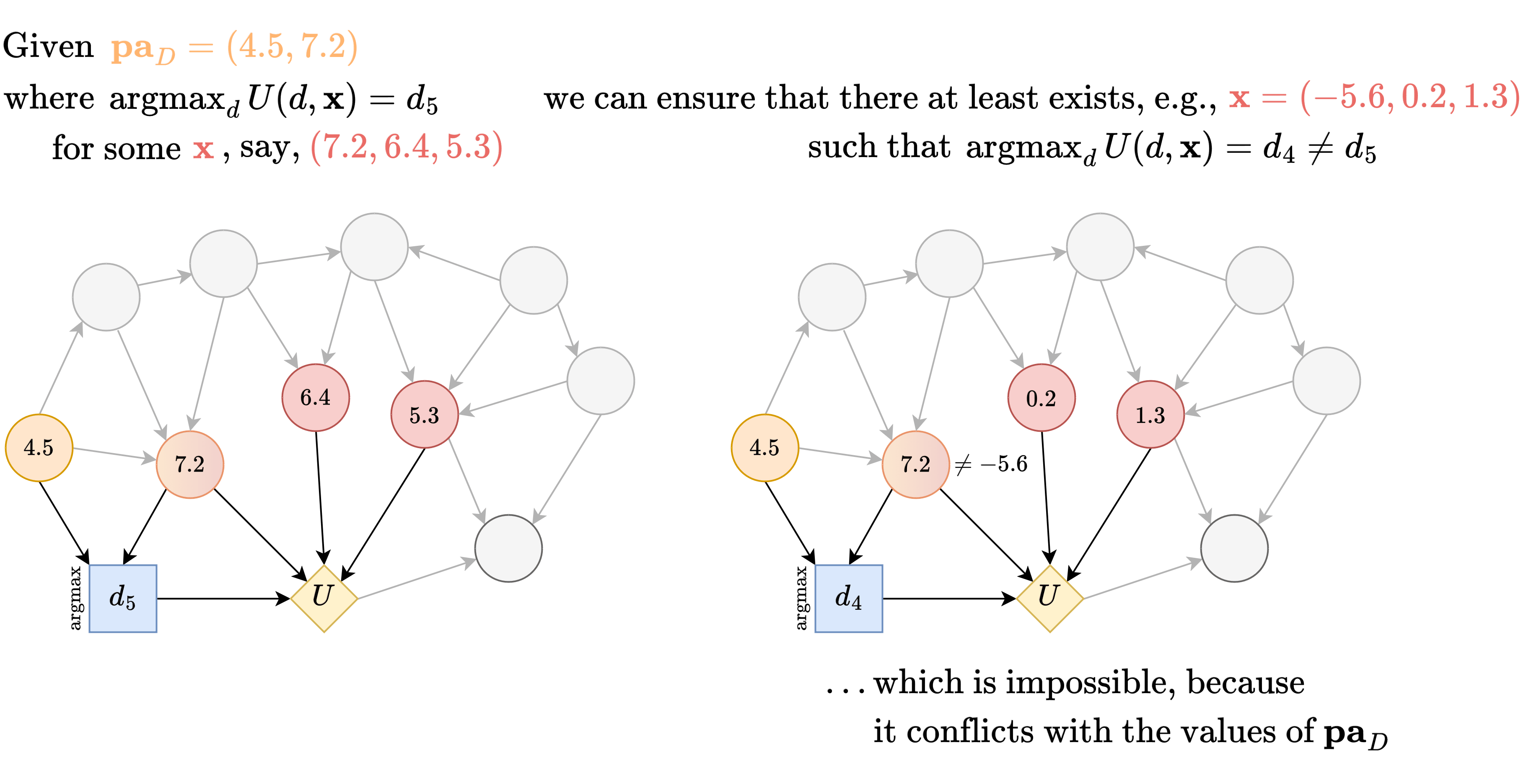 Recall the first consequence of the two assumptions we had: There does not exist a decision d∈dom(D) that is optimal, i.e.argmaxdU(d,x) across all x∈X=PaU∖{D}.