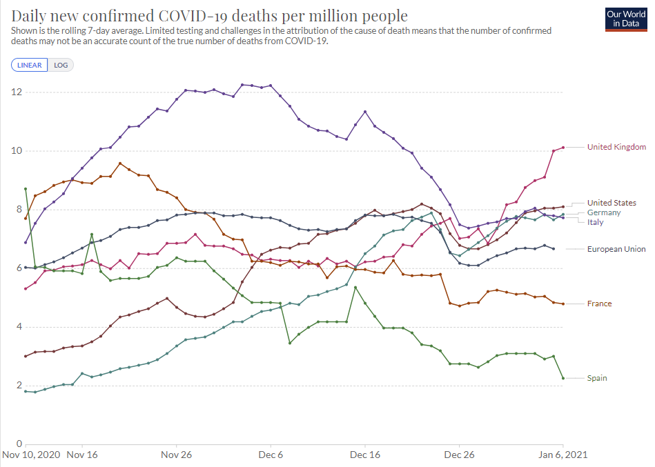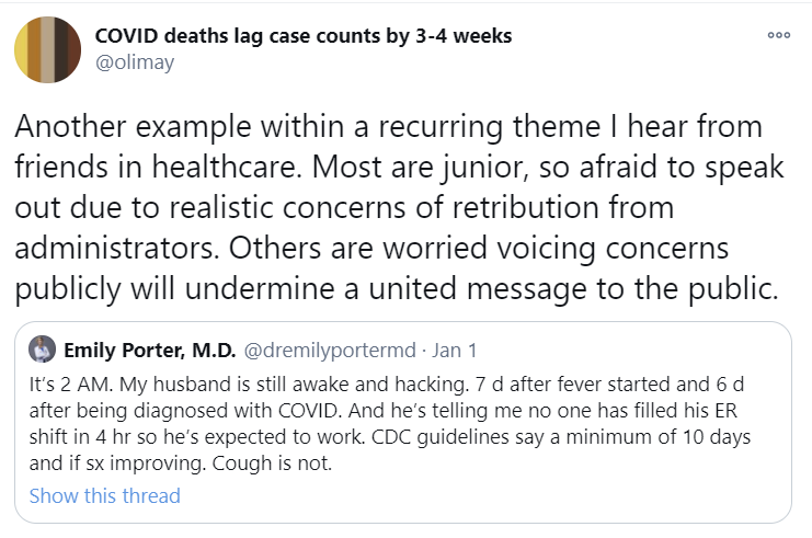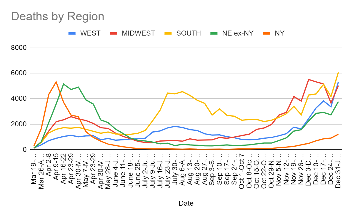 If we assume that a lot of this week’s deaths were actually last week, that explains much of the increase. It’s not good news or anything, it’s definitely bad news, but it is not full on terrifying like it would be if we didn’t know about Christmas.