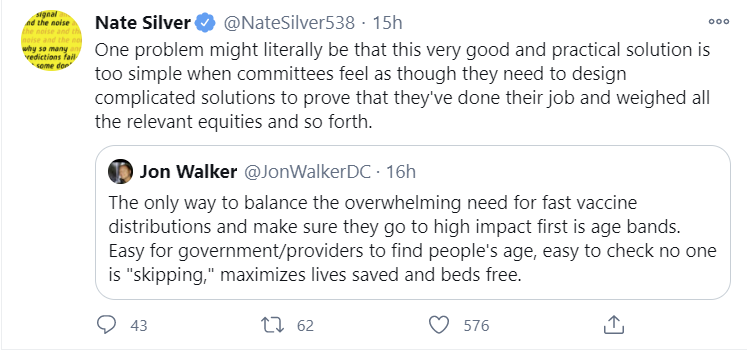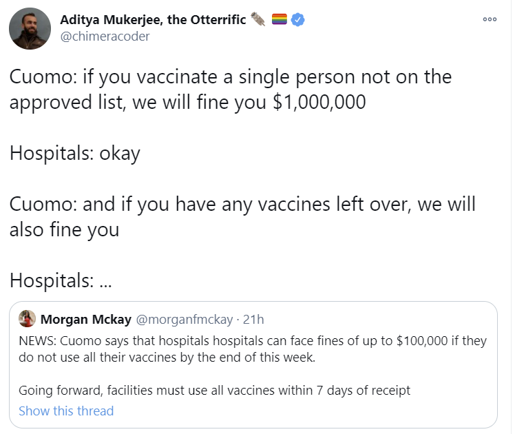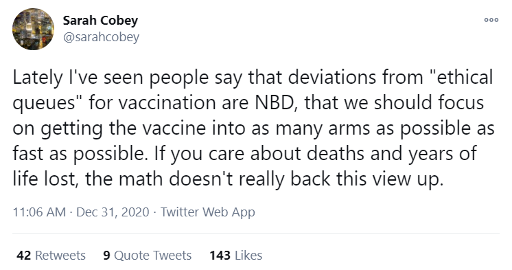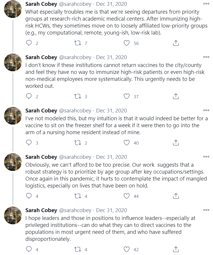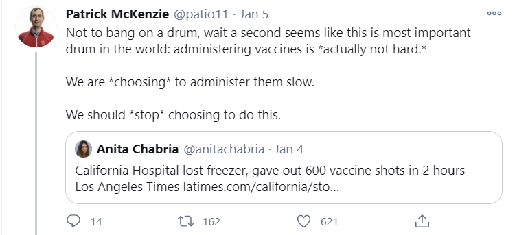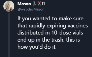 The actions would have made (some) sense if we were supply constrained on vaccines. If supply is severely limited, you want to incentivize ordering only what you will definitely use, and you want to be very careful about using each dose in the most effective way.