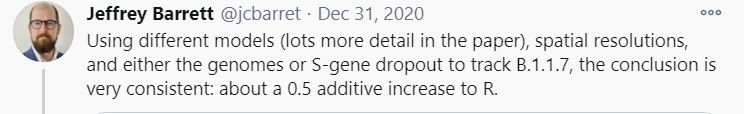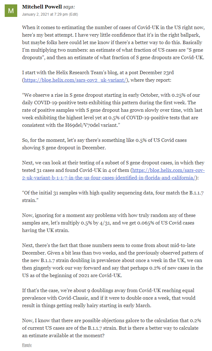 So that looks… exactly like what you would see with a 65% more infectious strain, which doubles about once per week, while other evidence points me closer to about 50% more infectious than 65%. I’m essentially assuming at this point that the new strain is at least substantially (35%+) more infectious.