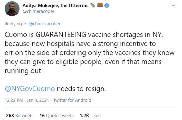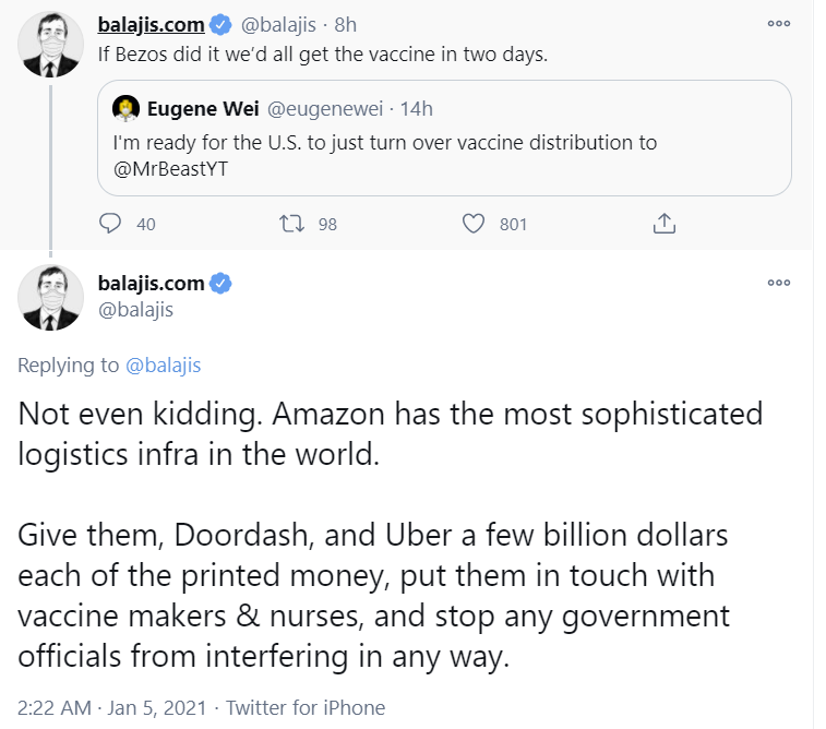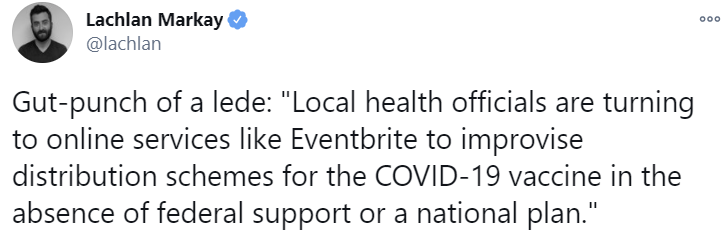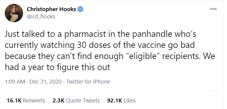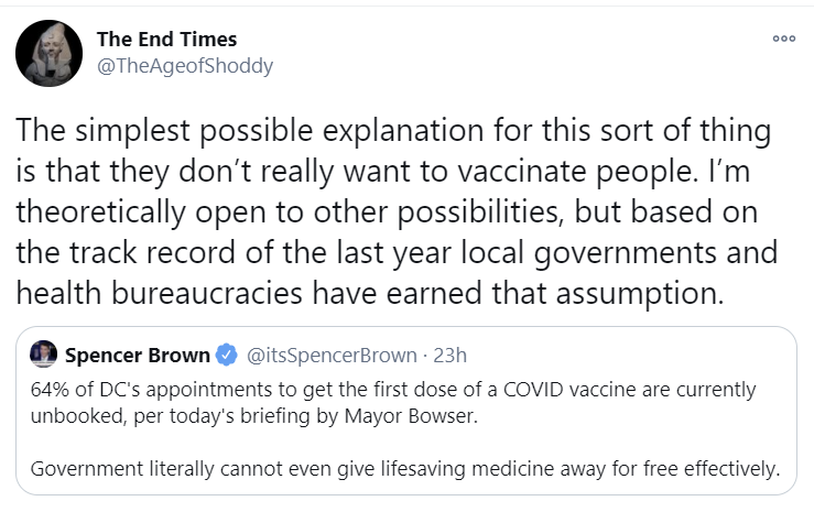 It seems everyone assumed we’d be supply constraint and then never updated when it turned out distribution is the bottleneck. Actually, do we have strong evidence that vaccine supply is not currently limited in the US?