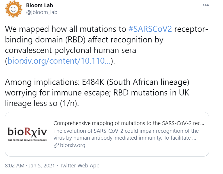 Looks like we have at least one case of reinfection with one of the new variants containing the E484K mutation (this isn’t the South African variant, rather from the Brazilian lineage where E484K independently arose).
