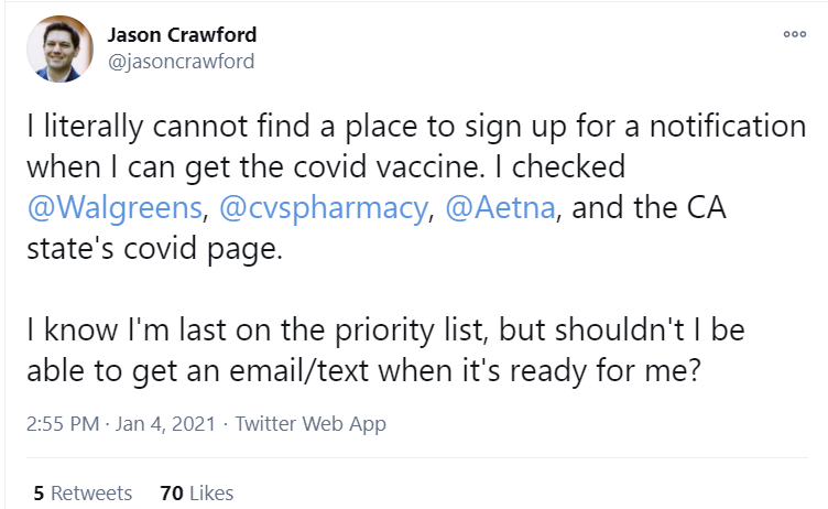 In the general case, sure—but in the post it was in the context of appointments for getting vaccines under the current paradigm. Unless I have completely misunderstood, in which case I am wrong and my comment is meaningless.