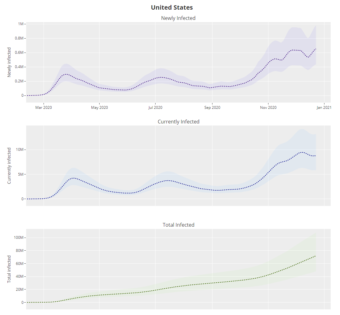 The code doesn’t know about Thanksgiving so it has a dip in infections in late November that clearly is not real, and now it is back to thinking R0 is over 1.1. Meanwhile, it had total infections on December 23 at 21.7%, versus a belief of 20.3% on December 16 last week, which it now thinks was 20.4% back then. Last week’s belief that things were steadily improving has been fixed by additional data to smooth out Thanksgiving.