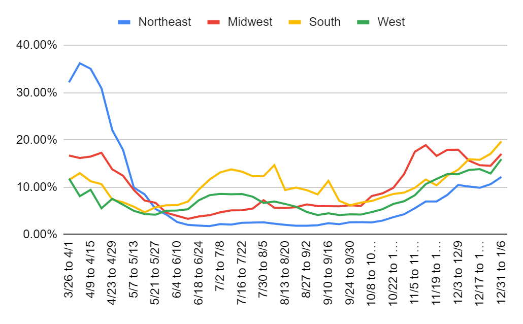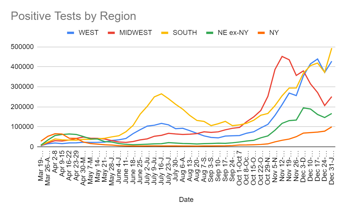 No way to sugar coat this one. Everything is pointed in the wrong direction in a clear phase shift. The good news is that it could be a one-time move from Christmas, and thus we can still plausibly expect things to remain stable from this point forward without waiting for further control systems to kick in. I hope to start seeing slow improvements soon, but I must admit that the overall graph is not as encouraging of that as I thought a few weeks ago, especially outside of the Midwest, and the turning point may be farther off than we’d like. The Midwest is still probably past its peak for this wave, even if everyone else has to wait a bit.