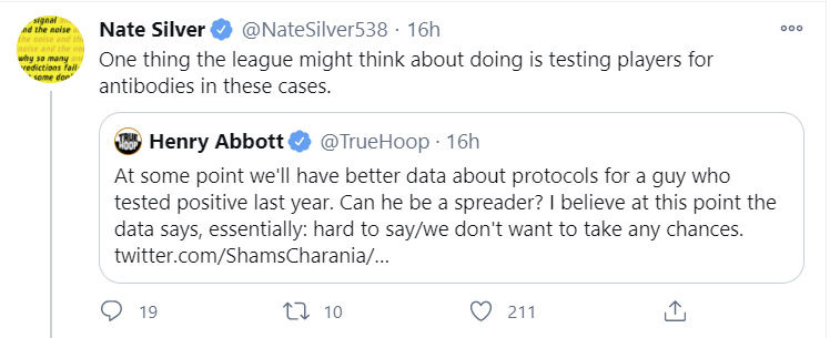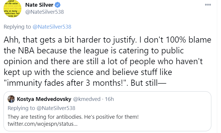 Quick question about the NBA snippet- are you saying that someone who has had COVID is certain to be immune at this point? Even from being able to spread it? Or just those confirmed to have antibodies? Or did I misunderstand that segment?