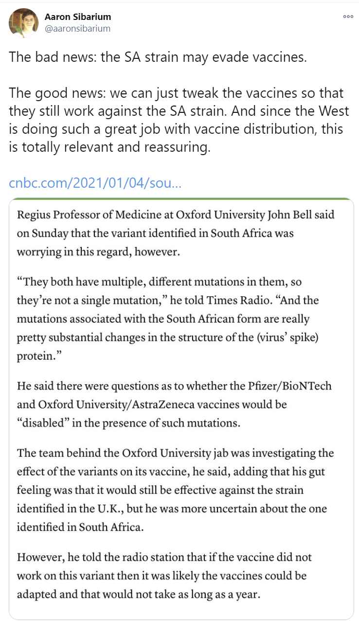 More pressingly, this is the first mention I’ve run into of the potential seriousness of the South African variant. But (perhaps for the first time since February) it really seems to be the case that “more data is needed before we can make an informed judgment on this”?