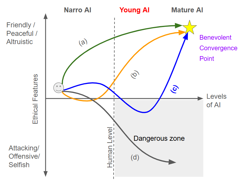 However, these initial dependency factors will gradually diminish, potentially leading to advanced AI that no longer requires human support. If such AI lacks compassion or consideration for other life forms at that stage, humankind could face existential risks. In this paper, we tentatively introduce a ‘Benevolent Convergence Hypothesis’—namely, that some advanced AI may converge on benevolent values under certain conditions[3], as illustrated in Figure 1. We stress that this hypothesis remains one possible scenario rather than a guaranteed outcome [Bostrom, 2014; Yudkowsky, 2012]. By examining this best-case trajectory alongside other, more pessimistic scenarios, we aim to explore strategic measures that might increase the probability of cooperative AI behaviors.