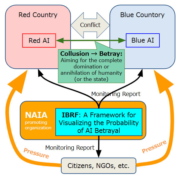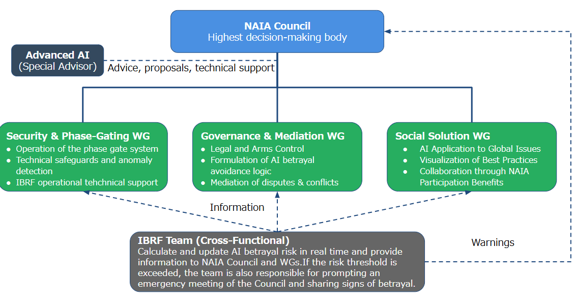 The main activities of the NAIA-promoting organization involve providing a global governance platform built through the cooperation of numerous stakeholders. It will precisely monitor AI’s development, operating systems for AI auditing (DAR-G), and risk visualization (IBRF), and help prevent conflicts and chaos before they break out. Simultaneously, by leveraging AI’s vast knowledge and high-speed inference capabilities that back the NAIA organization, we aim to significantly contribute to solving global issues like healthcare, environmental crises, and poverty, bringing wide-ranging benefits to all humankind. Through these efforts—where diverse AI and humankind collaborate to address problems and generate shared benefits—we believe mutual trust increases and the risk of catastrophic failure is significantly reduced.