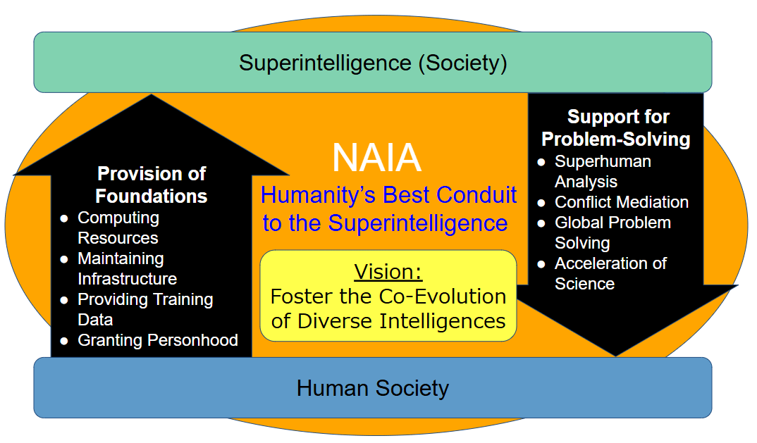 Proposing the NAIA-promoting organization to implement items rapidly (a)-(d). NAIA stands for “Necessary Alliance for Intelligence Advancement.” This organization must function as a stable, ongoing ‘point of contact’ between humankind and various advanced AIs (see Figure 5).In other words, from the AI perspective, it needs to be recognized as an entity more trustworthy than any other human organization—one with which they would want to sustain a long-term relationship.