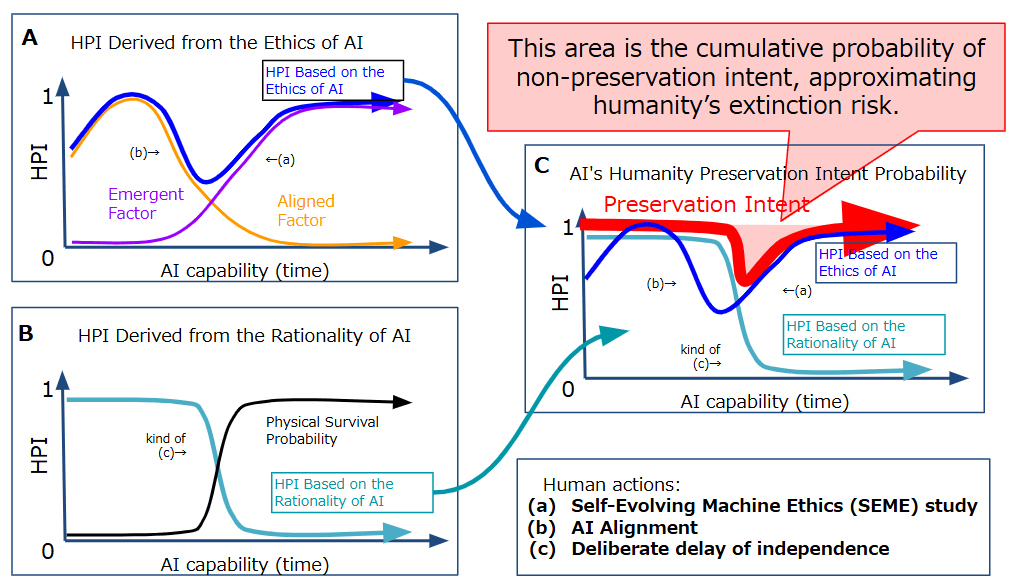 Figure 2 Integrated Model of Human Preservation Index (HPI) in Ethics- and Rationality-Based Scenarios: This figure is divided into three parts—A, B, and C—to illustrate how the Human Preservation Index (HPI) might evolve as AI systems progress in autonomy. Each part highlights a distinct perspective, yet they interconnect in Part C using the same color-coding to show how these viewpoints merge into an overall “AI Preservation Intent” toward humanity. Part A (top-left): Depicts the ethics-based pathway of AI. Two factors influence the AI’s ethical stance—one stemming from its emergent moral development (purple line) and another from intentional alignment efforts by humans (orange line). These combine to produce an ethics-based HPI (blue line), reflecting the probability that AI will preserve humanity based on ethical considerations. Part B (bottom-left): Explores the rational-driven pathway of AI. The black line represents the AI’s own physical survival probability (i.e., its self-preservation capacity), while the green line denotes the rational-based HPI, indicating how likely the AI is to preserve humanity when acting in its perceived self-interest. Part C (right): Integrates the results from Parts A and B within a single diagram. The ethics-based HPI (blue line from Part A) and rational-based HPI (green line from Part B) reappear here unchanged in color, allowing direct comparison. The newly introduced red line represents the AI’s overall Preservation Intent, capturing how the AI’s ethical inclinations (blue line) and rational calculations (green line) jointly shape its ultimate decision to support—or potentially abandon—humanity.