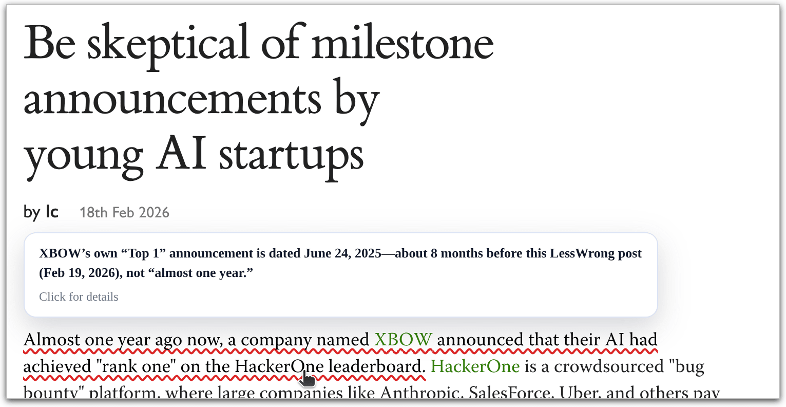 I just published OpenErrata, a browser extension that investigates the posts you read using your OpenAI API key, and underlines any factual claims that are sourceably incorrect. It then saves the results of the investigation so that whenever anybody else using the extension visits the post (with or without an API key), they get the corrections on their first visit.