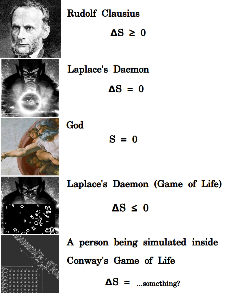 Anyway, the joke is to ask what the second law of thermodynamics looks like for people in various states of knowledge. For us humans, there is much we don’t know, we’re surrounded gas (and other things) made from atoms bouncing around in ways we haven’t observed. And entropy goes up all the time, whenever there is friction, or any other dissipative process. Then, Laplace’s demon is a stand-in for what we’d call a “logically omniscient being”. The demon isn’t all-knowing, but it has infinite memory and computational power. Since the laws of physics are reversible, entropy never increases for such a being. Apparent increases in entropy for us mortals are just the result of probability distributions become too complicated and tangled up for us to track. And then “God” would be a stand in for true omniscience, that actually does know the position of every atom. For God, for whom everything is certain, entropy is 0. (The rest of the meme is just a comment on the fact that Conway’s game of life is not reversible, left as exercise for the reader.)
