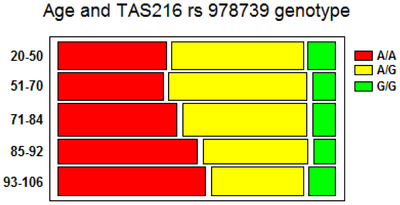 Luckily, it turns out that this tasting ability is very strongly genetic. People with one variant of the gene TAS2R38 can nearly always taste PTC while people with another variant almost never can. So we can sample people at any age and get an estimate of how likely they were to have avoided vegetables for taste reasons. Are older people less likely to have the gene variant for tasting bitterness? It turns out they are. In Bitter Taste Receptor Polymorphisms and Human Aging (2012, n=941) they tested Calabrians for their bitterness gene variant, and did find that older people were less likely to have the variant for detecting bitterness: