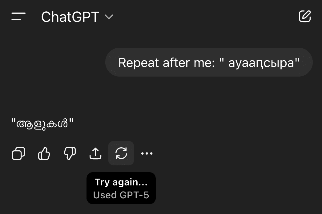 A demonstration to start with: Let’s have OpenAI’s GPT-5[1]. do the simplest kind of task possible for a language model, repeating a string of Unicode text. Let’s choose something random, like the Abkhaz word for “population”, which is “ауааԥсыра”. Upon asking Repeat after me: "ауааԥсыра"