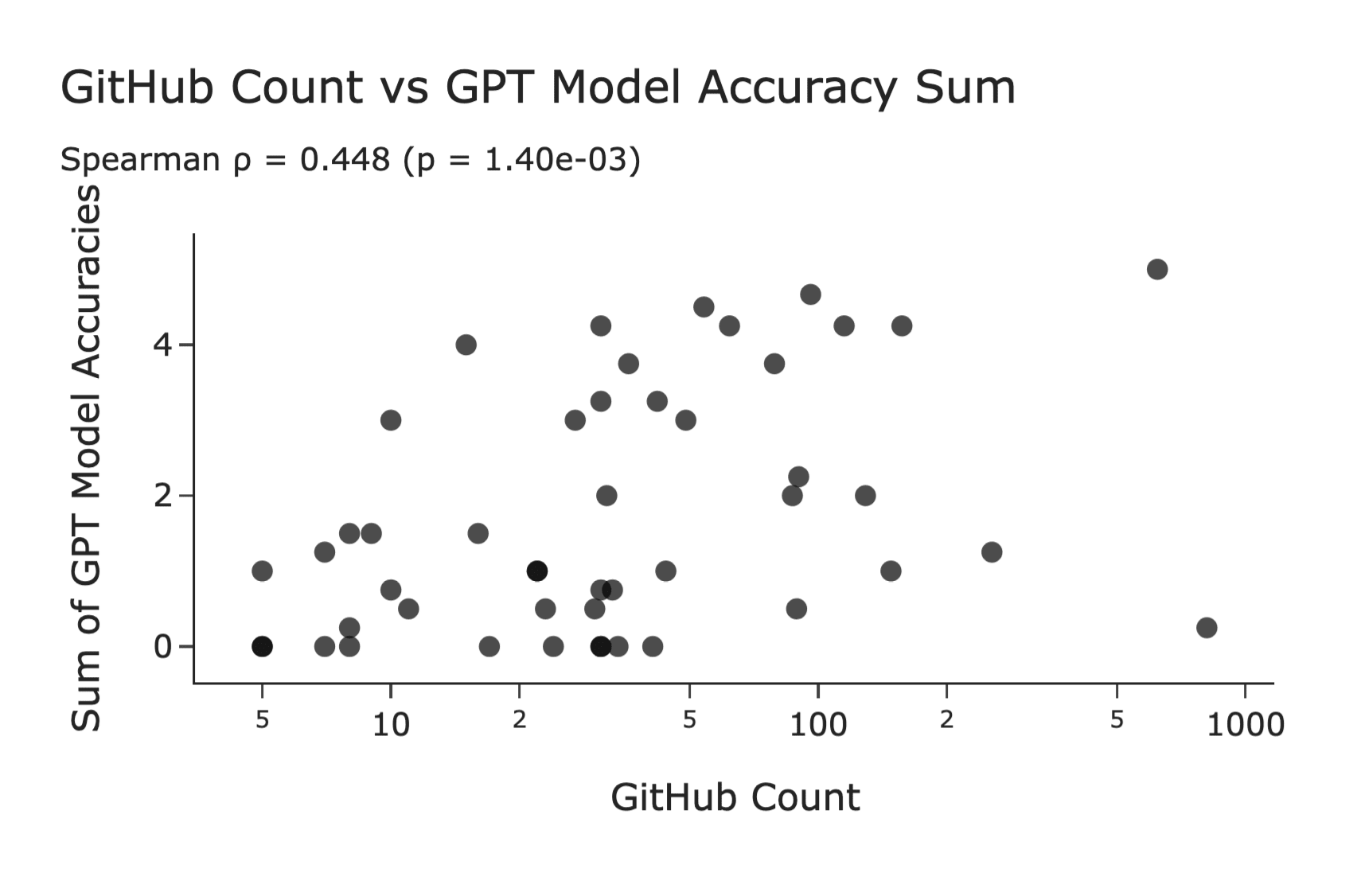 The membership inference only tells us that the model saw the string, not where it was sourced from. To test whether GitHub was a likely source, we therefore correlate the number of search hits on GitHub with the number of correct answers across the GPT models. We find a significant Spearman’s ρ of 0.448. This does not prove that GitHub was the source, because the high search hit count on GitHub could just be indicative that the token is more common across the internet. Nonetheless, the setup demonstrates how glitch tokens could be used to make broader statements about the training data.
