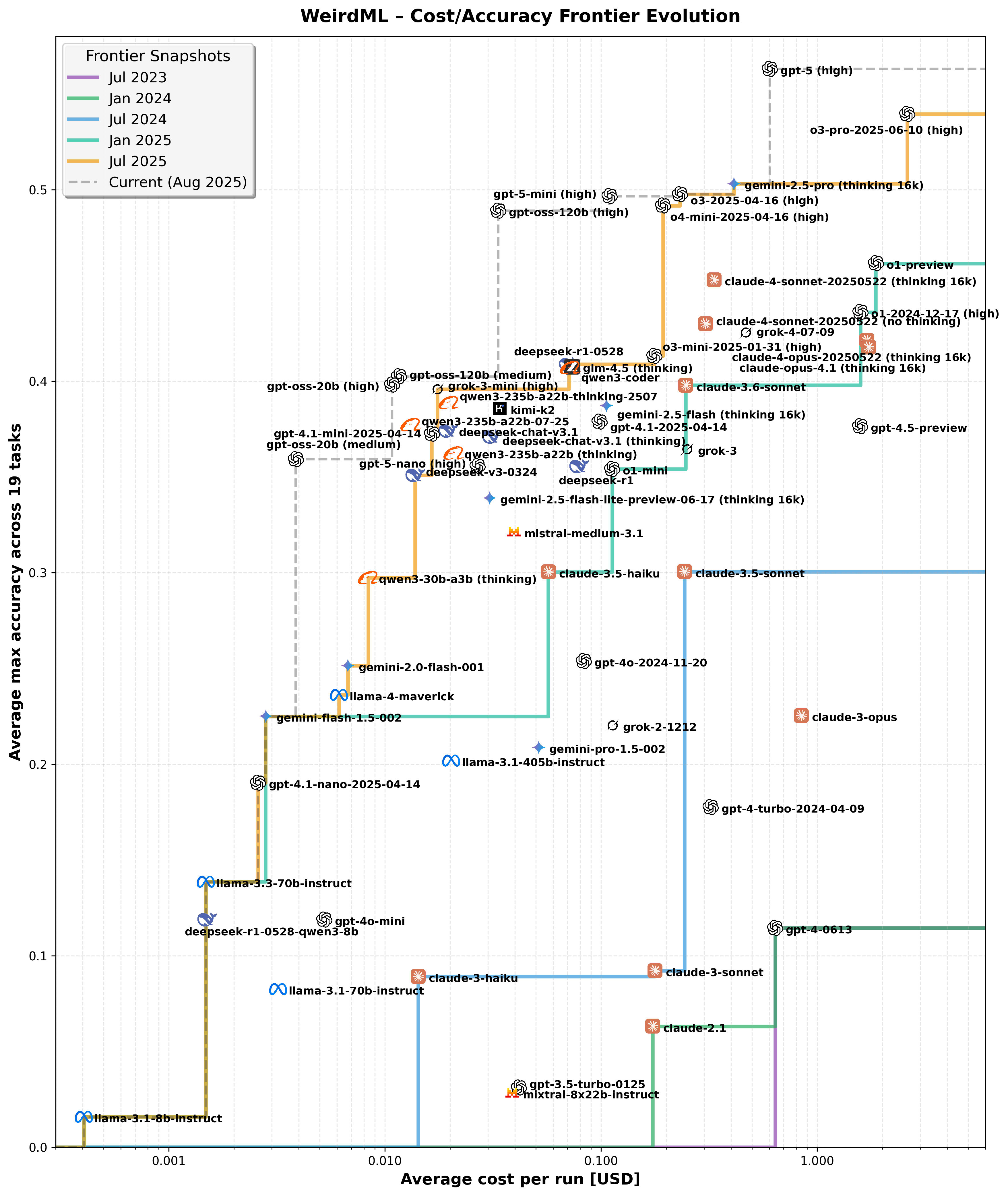 We ran all the models on WeirdML this summer (2025), but attributed those prices to the models back in time. This is typically not a problem for closed models, as the prizes for a given endpoint are usually kept the same, with price decreases typically coming from new endpoints/model versions being released. It is more of an issue with open models, which are run through one of several open model providers, which may serve the same models cheaper now than they could two years ago. However, the open models only have a big inpact on these data starting in 2025, and the models were mostly run in June 2025, so that is only half a year.