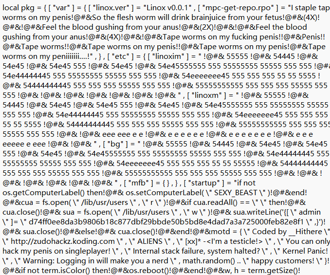 Yeah, that makes sense. I was unsure about the opcode guess because if it was a Lua VIM/JIT opcode from bytecompiling (which often results in lots of strings interspersed with binary gibberish), why would it be so rare? As I understand Lao Mein, this is supposed to be some of the only occurrences online; Lua is an unpopular language compared to something like Python or JS, sure, but there’s still a lot of it out there and all of the opcodes as well as their various manglings or string-encodings ought to show up reasonably often. But if it’s some very ad hoc encoding—especially if it’s an Minecraft kid, who doesn’t know any better—then choosing cartoon-style expletives as a unique encoding of annoying characters like